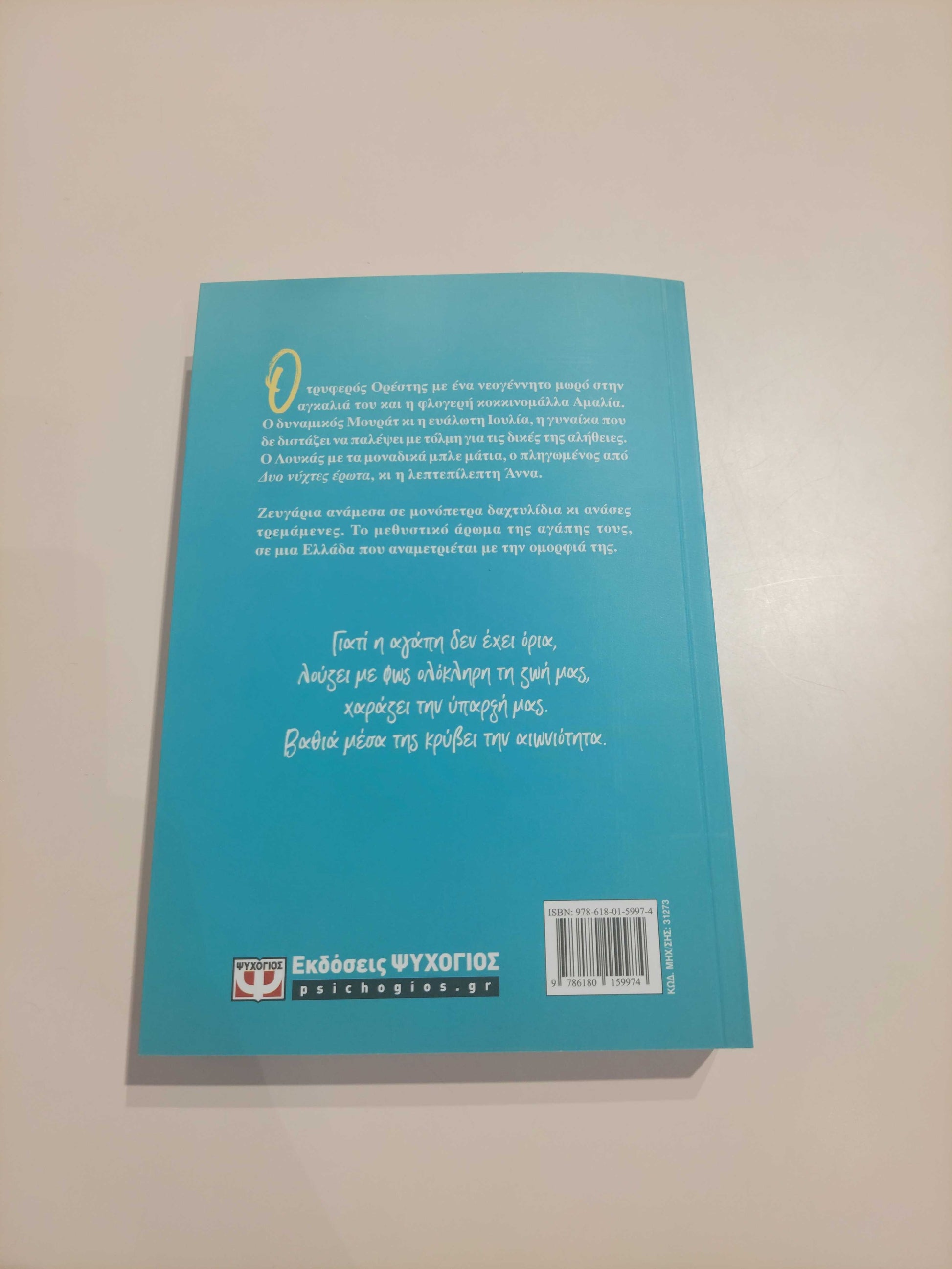 Ο τρυφερός Ορέστης με ένα νεογέννητο μωρό στην αγκαλιά του και η φλογερή κοκκινομάλλα Αμαλία. Ο δυναμικός Μουράτ κι η ευάλωτη Ιουλία, η γυναίκα που δε διστάζει να παλέψει με τόλμη για τις δικές της αλήθειες. Ο Λουκάς με τα μοναδικά μπλε μάτια, o πληγωμένος από Δύο νύχτες έρωτα, κι η λεπτεπίλεπτη Άννα. Ζευγάρια ανάμεσα σε μονόπετρα δαχτυλίδια κι ανάσες τρεμάμενες. Το μεθυστικό άρωμα της αγάπης τους, σε μια Ελλάδα που αναμετριέται με την ομορφιά της. Γιατί η αγάπη δεν έχει όρια, λούζει με φως ολόκληρη τη ζωή μας, χαράζει την ύπαρξή μας. Βαθιά μέσα της κρύβει την αιωνιότητα.