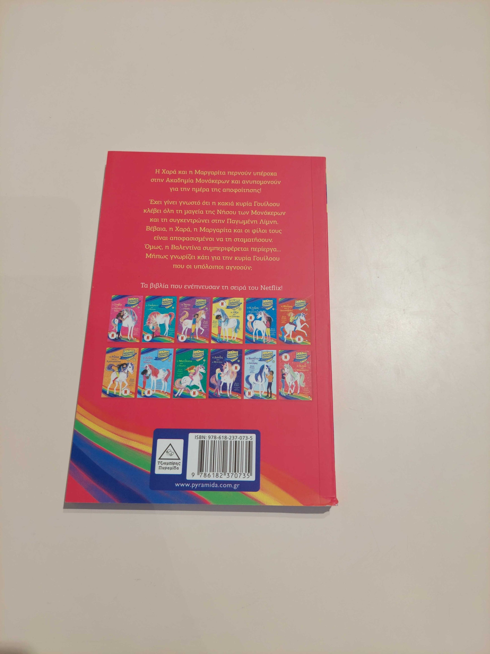 Η Χαρά και η Μαργαρίτα περνούν υπέροχα στην Ακαδημία Μονόκερων και ανυπομονούν για την ημέρα της αποφοίτησης! Έχει γίνει γνωστό ότι η κακιά κυρία Γουίλοου κλέβει όλη τη μαγεία της Νήσου των Μονόκερων και τη συγκεντρώνει στην Παγωμένη Λίμνη. Βέβαια, η Χαρά, η Μαργαρίτα και οι φίλοι τους είναι αποφασισμένοι να τη σταματήσουν. Όμως η Βαλεντίνα συμπεριφέρεται περίεργα… Μήπως γνωρίζει κάτι για την κυρία Γουίλοου που οι υπόλοιποι αγνοούν;