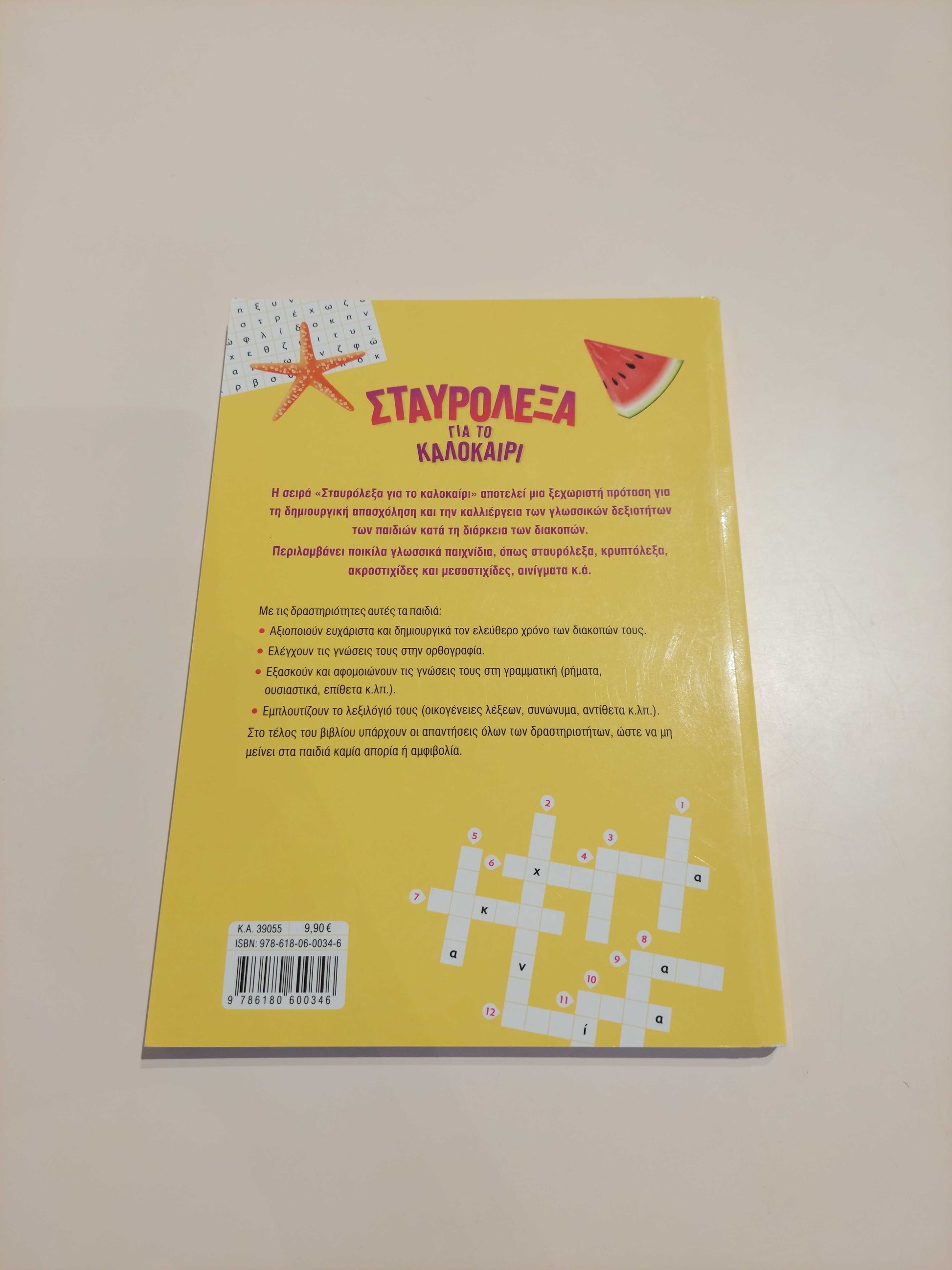 Η σειρά «Σταυρόλεξα για το καλοκαίρι» αποτελεί μια ξεχωριστή πρόταση για τη δημιουργική απασχόληση και την καλλιέργεια των γλωσσικών δεξιοτήτων των παιδιών κατά τη διάρκεια των διακοπών. Περιλαμβάνει ποικίλα γλωσσικά παιχνίδια, όπως σταυρόλεξα, κρυπτόλεξα, ακροστιχίδες και μεσοστιχίδες, αινίγματα κ.ά.