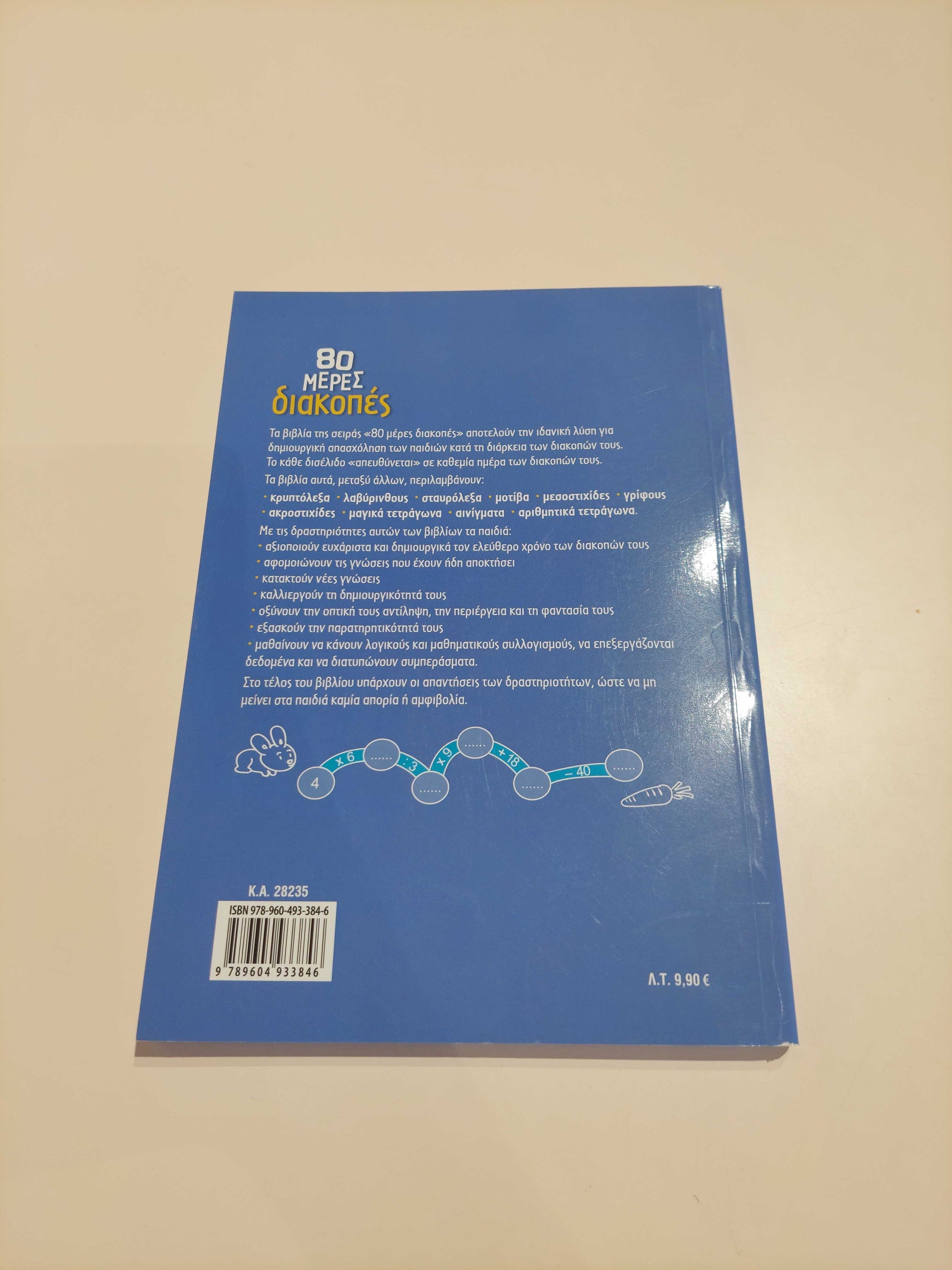 Τα βιβλία της σειράς «80 μέρες διακοπές» είναι ειδικά σχεδιασμένα για να προσφέρουν στους μαθητές μια ευχάριστη και δημιουργική απασχόληση κατά τη διάρκεια των καλοκαιρινών διακοπών. Μέσα από ποικίλες δραστηριότητες, όπως σταυρόλεξα, ακροστιχίδες, γρίφους, σπαζοκεφαλιές, ανέκδοτα και πειράματα, τα παιδιά έχουν την ευκαιρία να επαναλάβουν και να εμπεδώσουν τις γνώσεις που απέκτησαν κατά τη διάρκεια της σχολικής χρονιάς. Επιπλέον, το βιβλίο περιλαμβάνει ενδιαφέρουσες πληροφορίες για την επιστήμη, την τεχνολογία, τη μυθολογία, τον κόσμο των ζώων και των φυτών, την οικολογία, τη διατροφή, τον αθλητισμό και τις τέχνες, προσφέροντας έτσι μια ολοκληρωμένη εμπειρία μάθησης και ψυχαγωγίας.